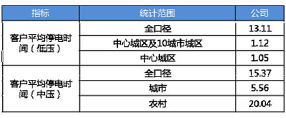 2018年公司客户平均停电时间(低压)为13.11小时/户,同比下降34.7%。 中心城区及10城市城区客户平均停电时间(低压)为1.12小时/户,同比下降53.9%;公司客户平均停电时间(中压)完成值为15.37小时/户,同比下降9.3%,其中城市和农村客户平均停电时间(中压)分别为5.56小时/户和20.04小时/户。