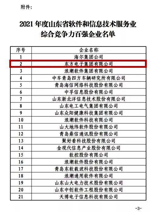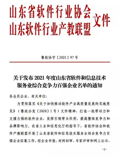 “2021年度山东省软件和信息技术服务业综合竞争力百强企业”评选,是山东省首次开展的软件行业企业评选工作。此次评选以企业规模、效益、研发创新、产品竞争力、市场开拓能力等方面进行综合评价,旨在打造一批带动力和支撑力强的软件企业,发挥其引领带头作用,提升山东省内软件行业整体竞争力和品牌影响力。
