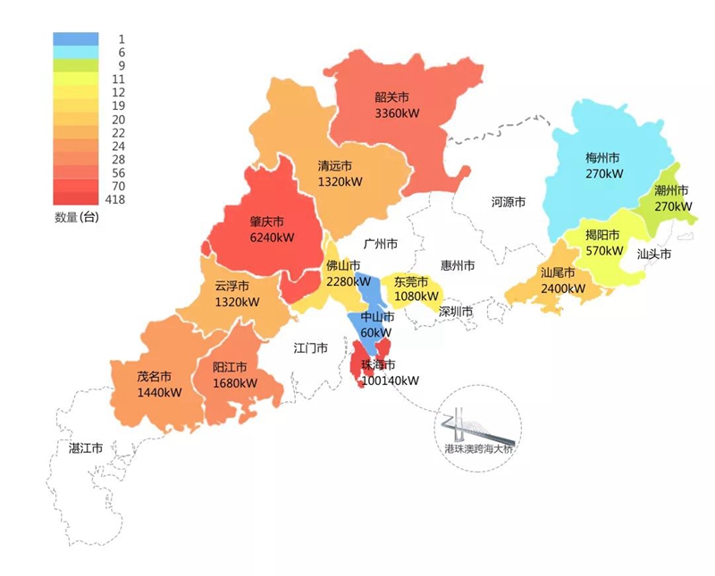 2018年,在港珠澳大桥充电桩项目中,千亿qy88国际官网入口在港珠澳大桥珠海端口岸人工岛搭建的充电管理平台及电能量采集终端,为大桥的绿色运营和电力保障提供技术支持。除此之外,仅广东省内,千亿qy88国际官网入口充电桩涵盖肇庆、珠海等14个城市,具体分布情况如下图所示。